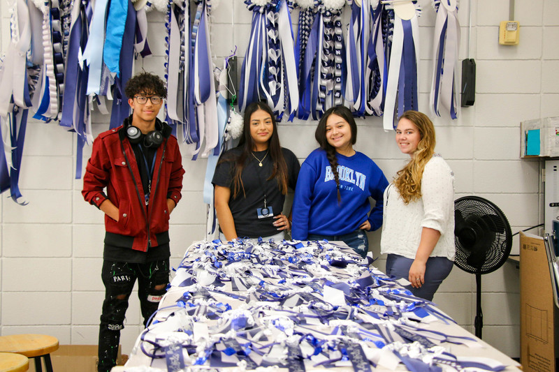 The blue-and-silver “Mega Mum” has been hanging in the Silver Cafeteria this week in honor of Homecoming week. Made primarily of paper, coffee filters and cardboard, the students said they did not know what to expect when their teacher Hannah Hawkins first introduced the idea.